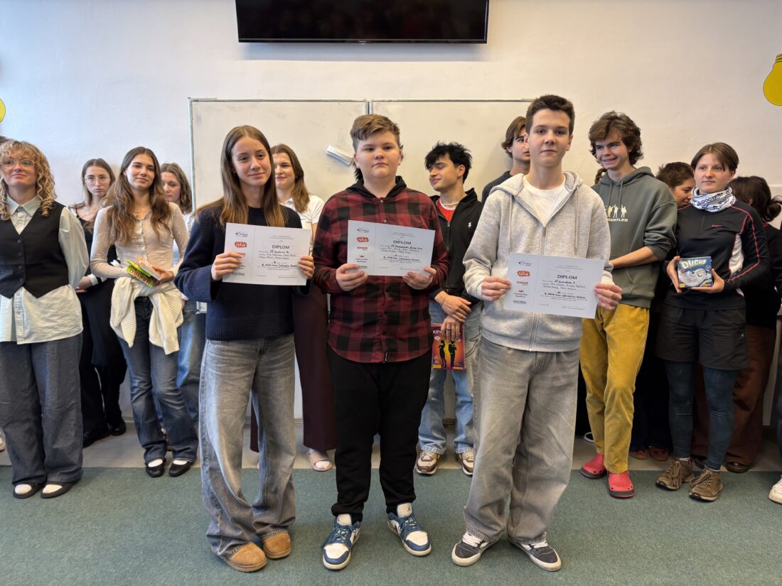 A proto se v pátek 21. 11. 2025 do naší školy opět po roce sjeli matematičtí a fyzikální nadšenci z gymnázií i základních škol z širokého okolí, aby poměřili své síly s celkem 1363 družstvy ze 7 evropských zemí. Během dvou hodin u nás řešilo 20 čtyřčlenných družstev zapeklité úlohy a obě družstva z našeho gymnázia předvedla skvělé výkony. Velkou pochvalu zaslouží zejména čtveřice ve složení Vendula Lédlová, Libor Lazur, Filip Akira Oliver Koblasa, kteří vybojovali 2. místo v našem okrese a celkově se umístili v první desetině všech družstev. Moc jim blahopřejeme.
