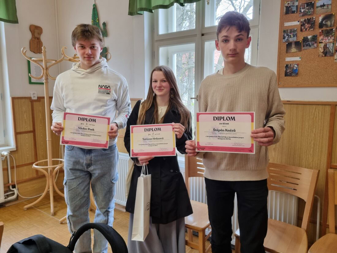 Ve středu 15. dubna se konalo krajské kolo olympiády španělského jazyka. Naši studenti Tatiana Hrůzová (Sp) a Václav Poek (Sx), kteří reprezentovali školu ve vyšší kategorii, získali 1. a 2. místo. Rovněž Štěpán Knězů (Kr) v dobrém světle ukázal své dovednosti v nižší kategorii a umístil se na 4. místě. Španělštinářům blahopřejeme a Táně přejeme úspěch v nadcházejícím celostátním kole.