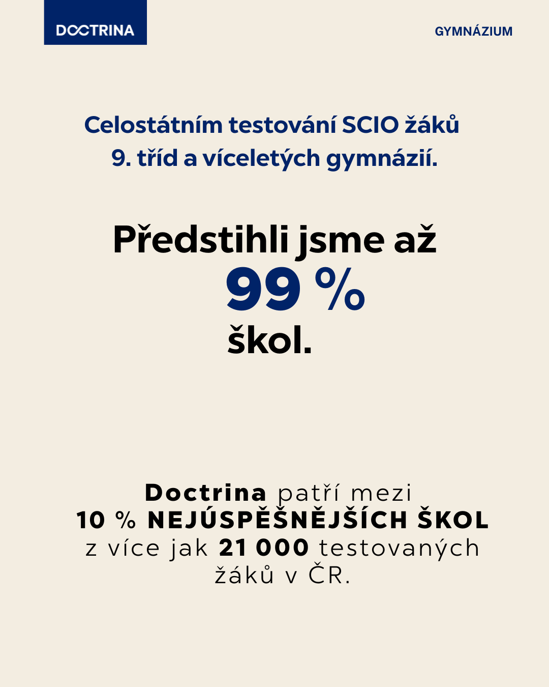 Gymnázium Doctrina se zároveň řadí mezi 10 % nejúspěšnějších škol v České republice z více než 21 000 testovaných žáků.